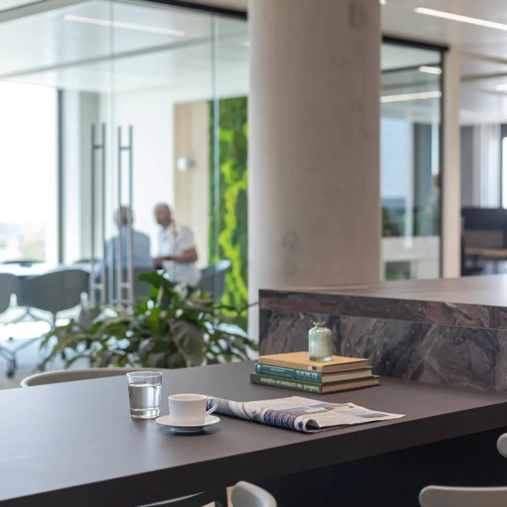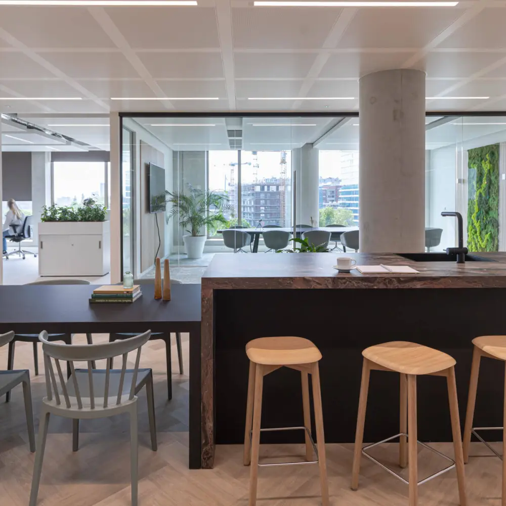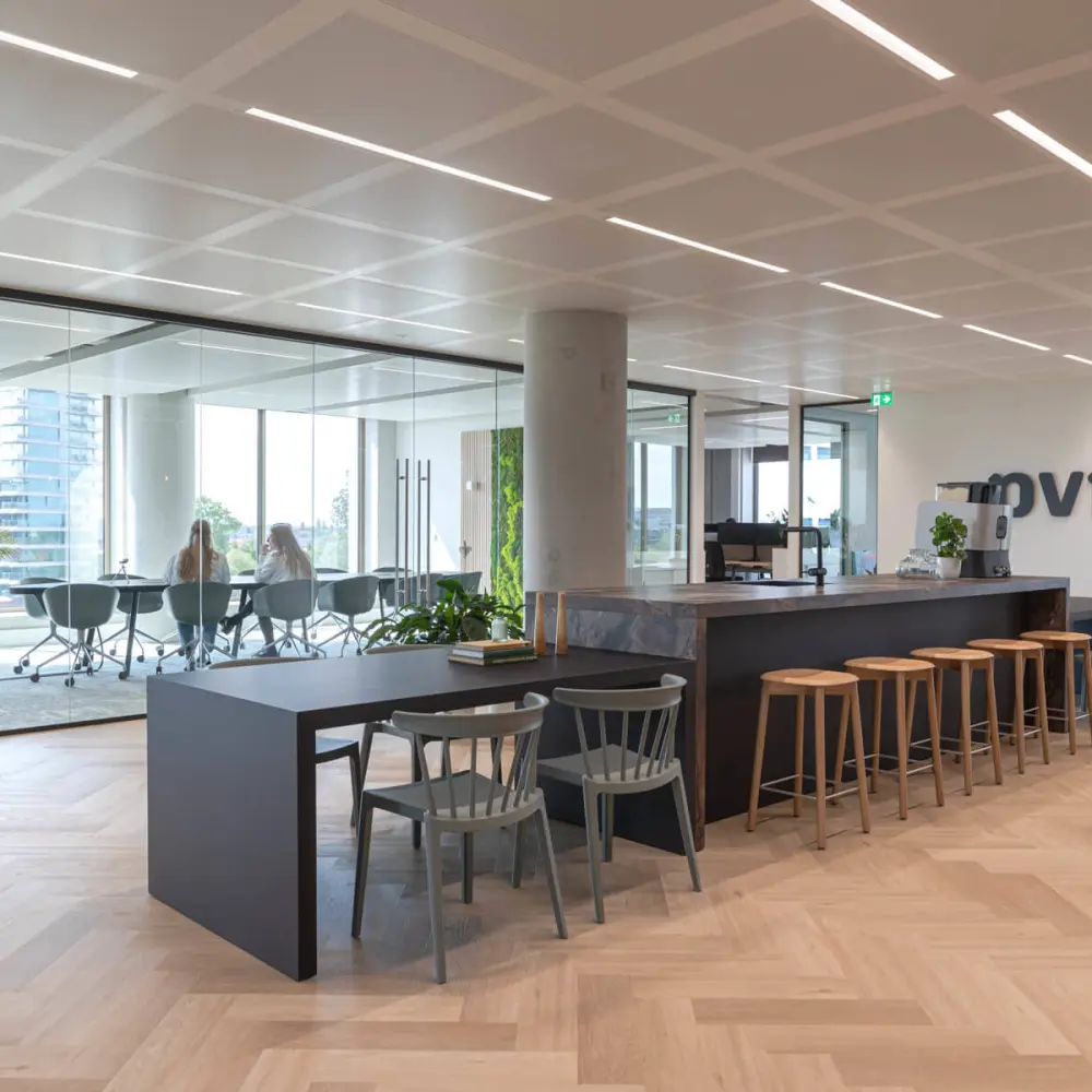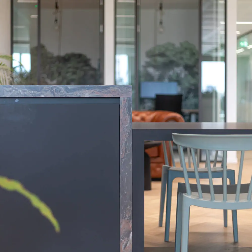 The centerpiece of the space had to become an eye-catcher - and believe us, it did! With a beautiful kitchen island in the middle of the space, we created a meeting spot for the entire team. Around the island, both open and enclosed areas were realized.